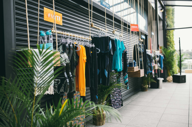 Backdrop instagramável e decoração com exposição de produtos para o Press day da coleção de verão 2019 da marca Track & Field.